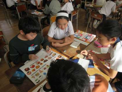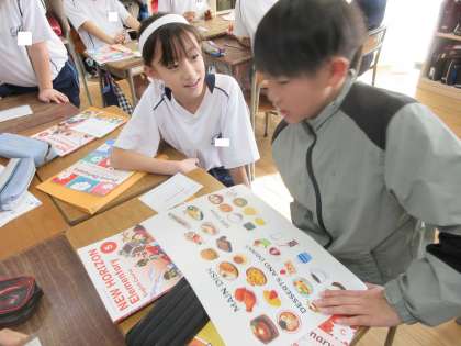 What would you like?(5年生) 公開日 2023/11/17 更新日 2023/11/17 5年生 外国語の学習では、英語で注文する表現を学びました。値段の書かれていないメニュー表から好きな食べ物を注文し、千円ぴったりを目指しました。なんと2人がピタリ賞を出し、某テレビ番組のように大盛り上がりの教室でした。