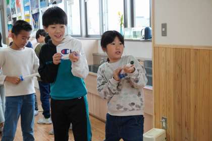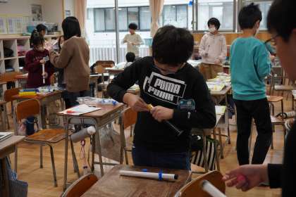 遠くまで飛ばすにはどうしたらいいかな(4年生) 公開日 2023/12/01 更新日 2023/12/01 4年生 理科でとじこめた空気と水の体積について学習をしています。 とじこめた空気について学んだことを生かして、つつにつめた玉が飛ぶ仕組みについて改めて考えました。 どのようにしたら、遠くに飛ばすことができるのか、楽しく確かめていました。