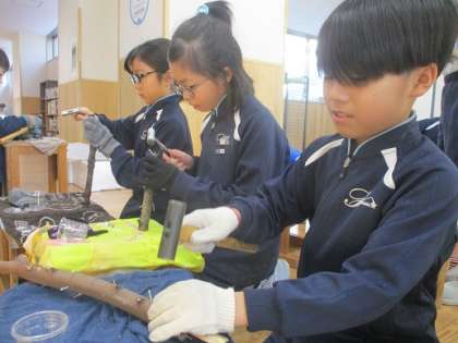 金づちを使って作品づくりに取り組んでいます。力加減を調節しながら、一本ずつ丁寧に打ち込んでいました。