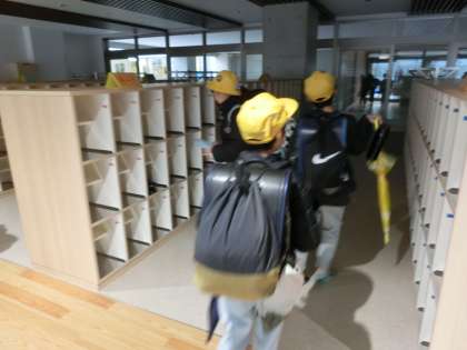 新校舎でのくらしが始まりました。子どもたちは「わーきれい」「これからもきれいに使っていきたいね」等と仲間と話しながら新しくできた校舎を見て回りました。大切に使っていきたいと思います。