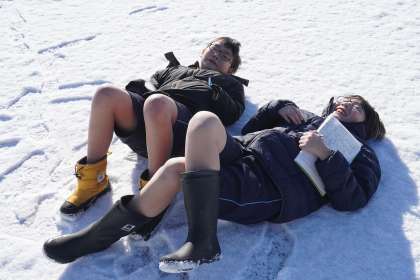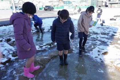 寒くなると〜その2〜(4年生) 公開日 2024/01/25 更新日 2024/01/25 4年生 観察時、気温は0度でした。 「0度になるとグラウンドの水たまりも凍るんじゃないのかな」 「寒いと雪がさらさらしているな」 「前はあんなにいた虫が全くいないよ。寒くなるにつれていなくなった」 気温に自然は変化されることに、観察を通して気付いていました。
