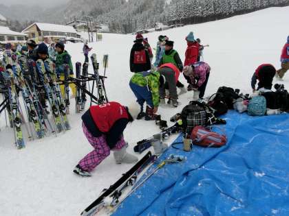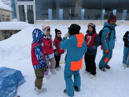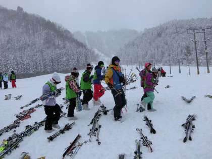 スキー学習へ行ってきました。自分でスキー靴を履いたりスキー板を持ち運びをしたりしながら準備をし、練習に励みました。