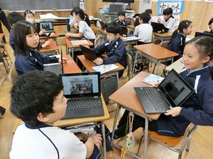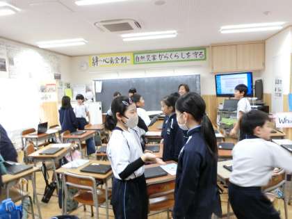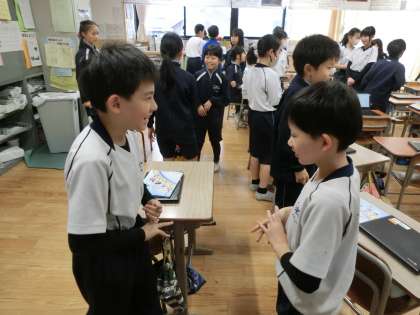 仲間と楽しく挨拶をしたあとは、自分のお気に入りの場所をファミリーの仲間に紹介し合いました。図書室や教室、オープンスペースなど様々な場所がお気に入りの子どもたちでした。