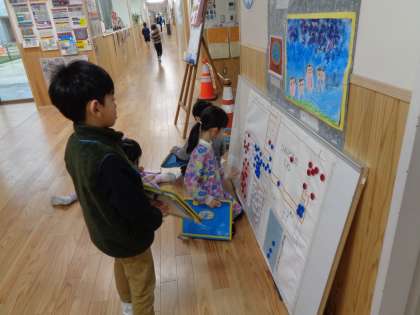 かずさがしビンゴ 公開日 2024/02/06 更新日 2024/02/06 1年生 算数「おおきなかず」の学習で、かずさがしビンゴをしました。学校にあるものの数を数えて、十の位の数字が同じマスに〇を付けていき、ビンゴを目指します。 子どもたちは、朝活動マグネットや図書室の椅子やパソコンのキーボードの数、階段などいろいろな数を数えながらビンゴを目指していました。