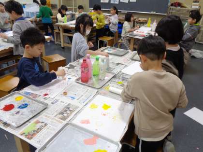 ぺたぺたぺったん(1年生) 公開日 2024/02/06 更新日 2024/02/06 1年生 図画工作科では、「ぺたぺたぺったん」の学習をしています。 ペットボトルキャップやトイレットペーパーの芯などを自分が選んだ絵の具につけ、画用紙にぺたぺたぺったんします。 子どもたちは、色の組み合わせや重なりを楽しみながら活動に取り組んでいます。