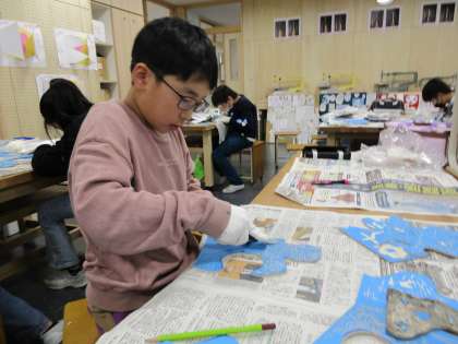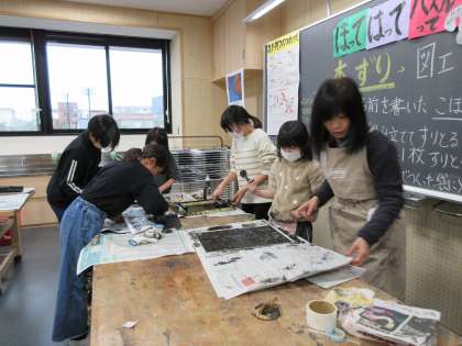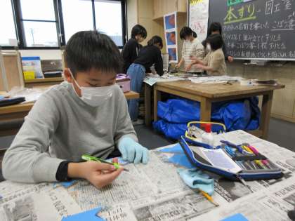 図画工作科の学習では、パズル版画に取り組んでいます。1枚の板を切り分け、そこに彫刻刀で模様を描いていきます。どの子も、真剣な表情で掘り進めていました。いよいよ印刷に取りかかった子どもも見られ始め、完成が楽しみです。