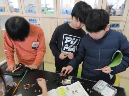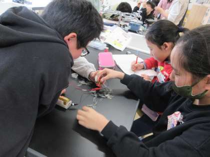 理科の学習では、電磁石の性質について実験を通して学びました。電磁石は鉄を引きつけるのか、極はあるのかなど、ファミリーで協力して取り組みました。