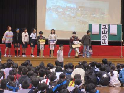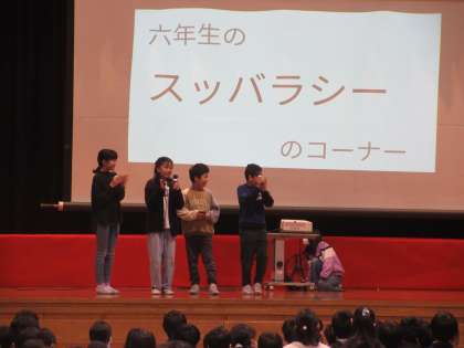 6年生さんに感謝の気持ちを届けようと、卒業を祝う集会を行いました。5年生だけで集会を企画・運営するのは初めての経験でしたが、子どもたちは、自分たちらしい楽しい集会にしようと一生懸命準備してきました。