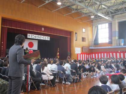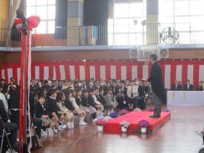 6年生の合奏に合わせて入場してくる新1年生を在校生が、拍手で温かく迎えました。そして、自分の席に座った1年生は、担任に名前を呼ばれると、「はいっ!」と、手をピンと挙げて、元気に立って返事をしていました。