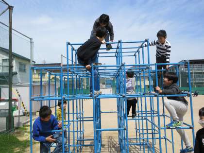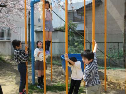今日は、とても暖かく、グラウンドの桜も満開を迎えました。美しい花がせっかく咲いているので、みんなで桜の花を見たり、記念撮影をしたりしました。また、子どもたちは、ジャングルジムや登り棒等で体を動かし、春の暖かさを楽しんでいるようでした。