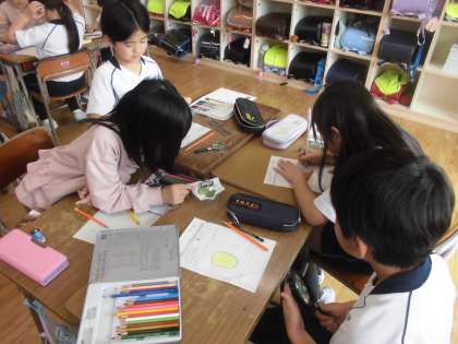 理科で、モンシロチョウの卵を観察しました。「卵に線が入っているよ」「黄色だけかと思っていたけど少しオレンジ色にもなっているよ」と、虫めがねを使って細かく観察していました。