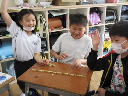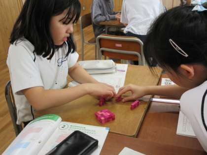 算数科では、立体の体積について学習しています。1㎤のブロックを並べて直方体を作る活動を行いました。子どもたちは、ブロックの数を式で表すことができることに気付いたり、同じ50㎤でもいろいろな形になることに驚いたりするなど、楽しみながら理解を深めていました。