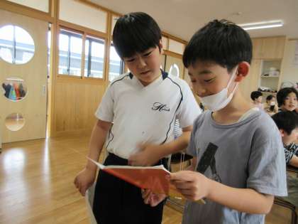 国語科の学習では、自分の名前を使ってあいうえお作文を作りました。子どもたちは苦戦しながらも、好きなものや苦手なこと等をうまく文章に取り入れていました。積極的に声をかけ合って自分の作文を紹介していました。