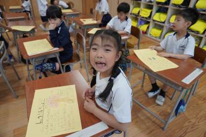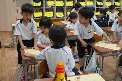 お互いの招待状を見ながら、集会がもっと楽しみになった1年生です。