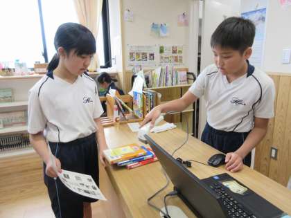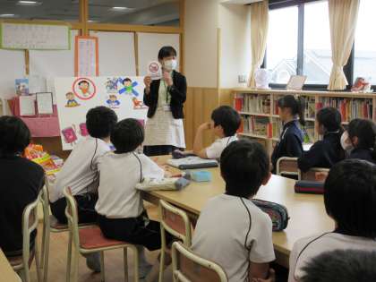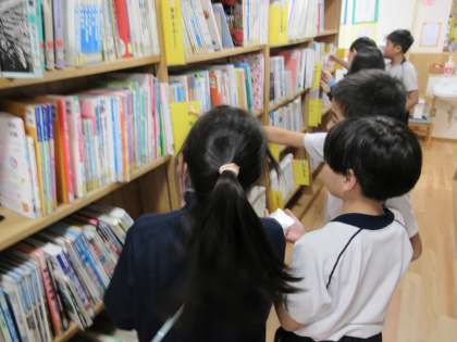 図書室で司書の先生とオリエンテーションを行いました。図書室でのマナーや本の扱い方等を改めて教えてもらいました。後半では、ファミリーの仲間と協力して、司書の先生から指定された本を探すゲームを行いました。「今年もおすすめ30を達成しよう」「たくさん読んで記録を伸ばそう」と子どもたちは自分の目当てを明らかにしていました。