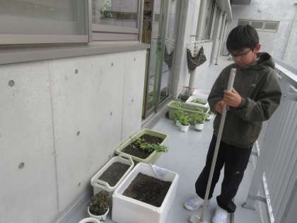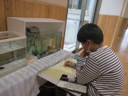 陸上のトレーニングを継続する子ども、水槽をじっくり見ながら丁寧に絵を描く子ども、ベランダで野菜を栽培する子どもなど、それぞれ生き生きと活動しています。