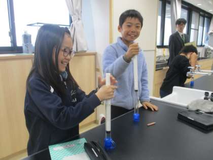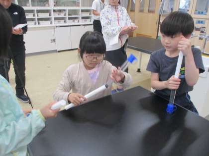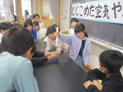 理科の新しい学習が始まりました。子どもたちは、閉じ込めた空気や水に力を加えながら、物質の性質を体感していました。