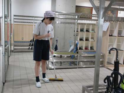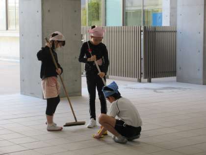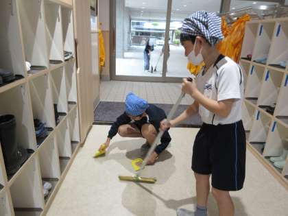 朝活動の時間に児童玄関を整えている子どもがいます。「全校の人が通るから汚れやすいな」「いつもきれな玄関にしたいな」と自分の思いをもって取り組んでいます。5年生のまちだけでなく、高学年として学校中を自分たちの手で整えようと意欲を高めています。