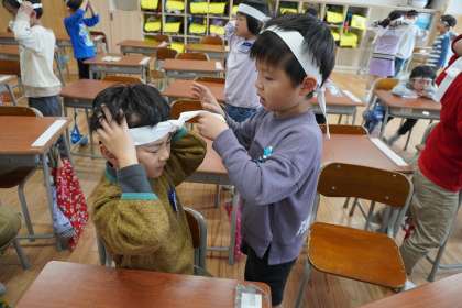 1年生は、はちまきをもらい、実際に頭にまく練習をしました。