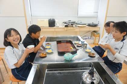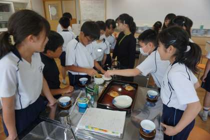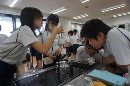 家庭科「わたしの生活大発見!−お茶をいれよう−」学習では、教科書や図書室の本等を活用し、ファミリーの仲間や個人で調べてきたお茶の淹れ方を基にしてお茶を淹れる活動に取り組みました。