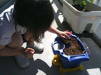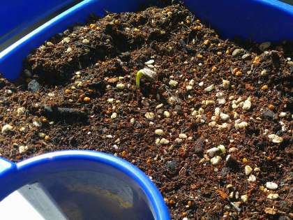 朝の水やりで、ひまわりの種から芽が出ているのを発見しました。