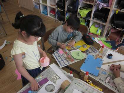 図画工作科の学習で割りピンを使って、回転したり、動いたりする作品制作をした子どもたち。