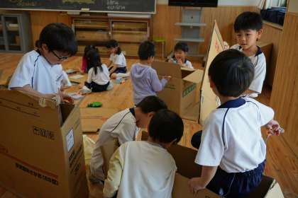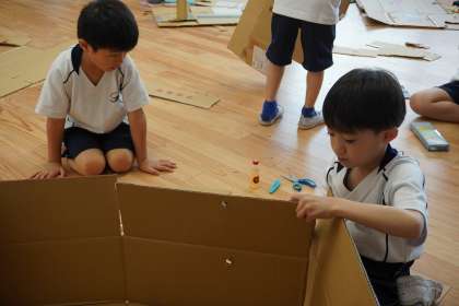 なかよしまつりを開こう〜その1〜(1年生) 公開日 2024/05/27 更新日 2024/05/27 1年生 1年プレイルームを、「なかよしをふやそう」の学習のために、自由に使ってもよいことになり、子どもたちは大喜びです。 部屋で何をしたいか聞くと、「段ボールでみんな入れるお家をつくりたい」「食べ物屋さんを作りたい」と話しました。それを聞いていた子が「お祭りみたいだ」と話し、「1年2組なかよしまつり」を開催することになりました。