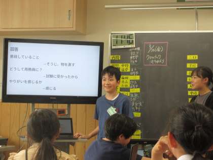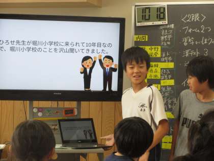 国語科の学習では、堀川小学校のよさについて、先生方にインタビューを行いました。堀川小学校に長く勤めておられる先生方から、「校舎が新しくなっても、昔から堀川の子どものよさは受け継がれている」というお話をうかがい、子どもたちはとても嬉しそうでした。