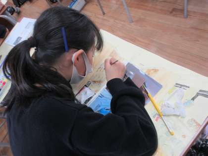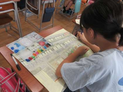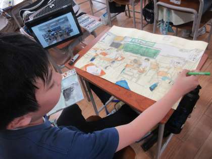 図画工作科の学習では、校舎を描いています。細かいところまでじっくり見て、丁寧に取り組んでいます。