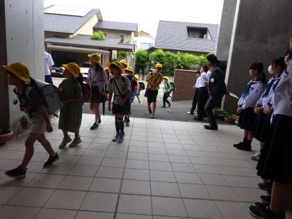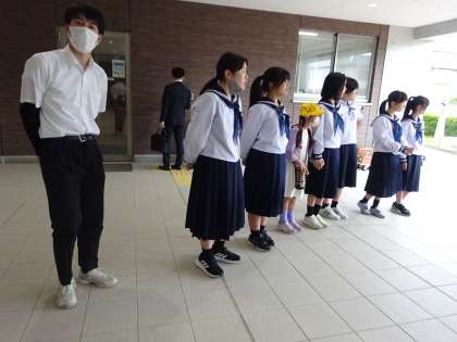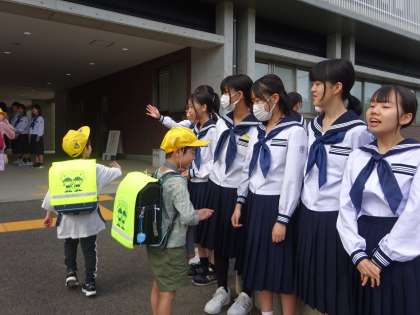 小中連携のあいさつ運動が行われました。朝から正面玄関では、堀川中学校の皆さんとくらしづくり委員会が、元気なあいさつで迎えてくれました。少し恥ずかしそうな様子で、あいさつを返したり、明るい笑顔でうれしそうにあいさつを交わしたりする子どもの姿も見られました。堀川校区の子どもたちが手を取り合い、すてきなあいさつの輪を広げています。