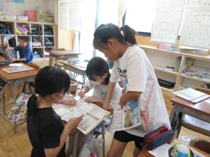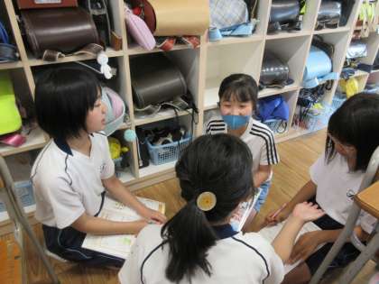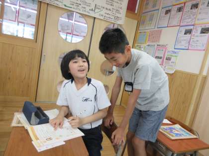 外国語科の学習では、誕生日や欲しいものを尋ねたり、答えたりする活動を行なっています。英語表現を覚えた子どもたちは、仲間へのバースデーカードづくりに取りかかりました。仲間に質問して、楽しみながら必要な情報を聞き出していました。