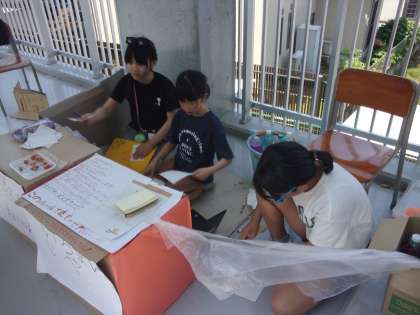 プレオープンを終えた子どもたちは、早速それぞれの屋台やパフォーマンスの修正を行い始めました。ルールを書いたポスターを作って並んでいる間に読んでもらおうとしたり、通路に屋台の魅力を伝えるスライドを流して宣伝しようとしたりするなど、本番に向けてさらに知恵を絞って行動に移していく子どもたちの姿が見られました。
