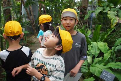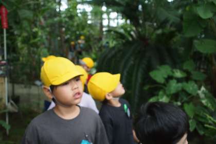 午前の活動の様子です。5つある温室をファミリーで見学しました。果物がなっている様子や見たことのない植物を見ています。植物に興味津々な子どもたちです。