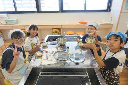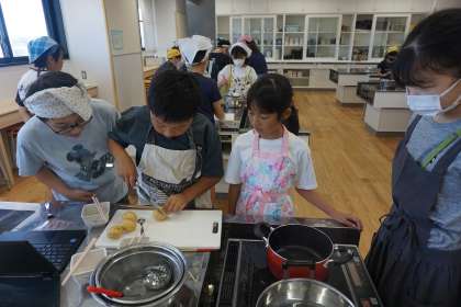 ゆでる調理でおいしさを発見しよう!(5年生) 公開日 2024/06/21 更新日 2024/06/21 5年生 家庭科「ゆでる調理でおいしさ発見!」の学習では、これまでファミリーの仲間と立ててきた計画を基に、「ほうれん草のおひたし」、「ゆでじゃがいも」の調理に取り組みました。子どもたちは、茹でる時間を気にしながら、丁度いいゆで具合で調理していました。ファミリーごとのこだわりも見られ、それぞれが楽しそうに取り組む姿が見られました。