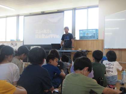 講師の先生から、立山の魅力や登山の安全な歩き方について教えていただきました。自分たちでも少しずつ立山について調べている子どもたちでしたが、初めて知る情報をたくさん教えていただき、立山登山当日がさらに楽しみになったようです。