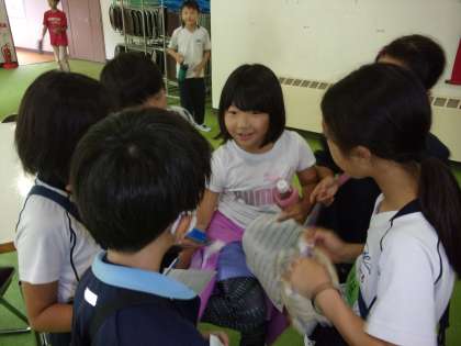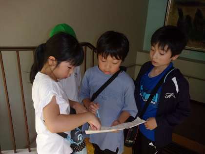 午前中は「館内オリエンテーリング」を行いました。あいにくの雨模様で予定していた舟遊びはできませんでしたが、館内に隠されたカードを探しながら謎を解いていく活動に子どもたちは面白さを感じ、熱中していました。ファミリーで知恵を出し合いながら、協力して問題を解くことで、ファミリーの仲を深めようとする子どもたちでした。