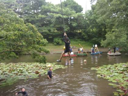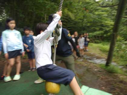 午後は天気も回復し、外でターザンロープやいかだ遊び、竹ジャングル等の池遊びを行いました。多くの子どもがターザンロープで池に飛び込んだり、いかだで池に浮かんだりするなど、呉羽の自然に思い切り親しむ時間となりました。