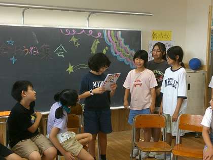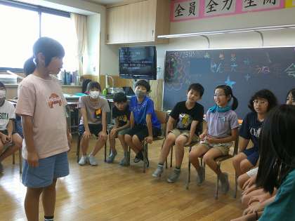 1学期で転出する仲間を思って「また会おうね集会」を開催しました。フルーツバスケットや椅子取りゲーム、爆弾ゲーム、プレゼント渡しなど、熱中症対策もしながら、涼しい教室でできる活動に取り組みました。企画と運営に携わった子どもたちは臨機応変に動き、会をスムーズに進行しました。