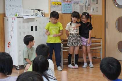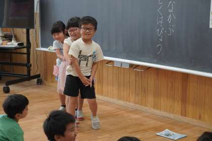 ファミリーごとに音読の工夫が違い、子どもたちは互いの音読をよく聞いて笑顔を見せていました。