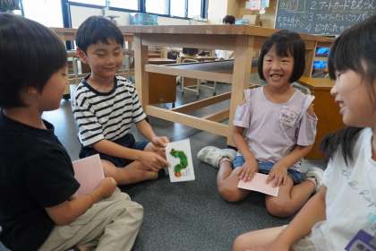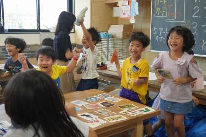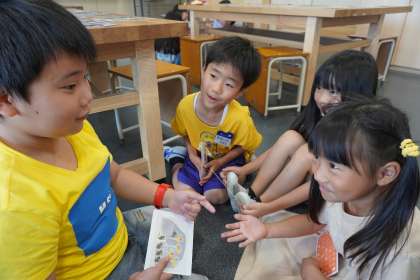 アートカードを使おう〜その2〜(1年生) 公開日 2024/07/25 更新日 2024/07/25 1年生 さらに、先生に提示されたパーツを当てるクイズをファミリー対抗で行いました。 顔をカードに近づけて、真剣に小さなパーツを見付けていました。 人によって感じ方が違うことに楽しさを感じながら学習していました。