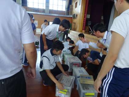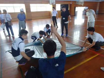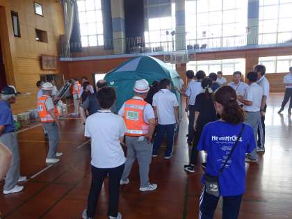 7月25日、体育館で富山市堀川地区センターや堀川校下自治振興会、自主防災連合会の方々と、避難所開設訓練を行いました。災害が発生したときに、円滑に避難所が開設できるよう、避難所運営備品の確認や、居住スペースや物資保管場所の確保、ワンタッチパーテーションの設置や特設公衆電話の設置等を実際に解説していただきながら確認しました。