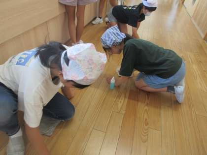 1学期中、床の汚れがなかなか取れないことに悩んでいたAさんは、夏休みに汚れが落ちやすい洗剤について研究し、自作の洗剤を持ってきてくれました。早速、朝活動の際に使ってみると、よく汚れが取れ、喜ぶAさんの姿が見られました。