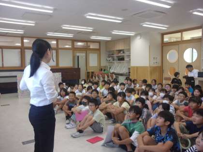 教育実習生が始まりました(4年生) 公開日 2024/09/01 更新日 2024/09/01 4年生 今日から教育実習が始まりました。4年生も3名の実習生を迎え入れ、新しいくらしをスタートさせました。教生先生こんにちは集会では、実習生の自己紹介の後、学級毎にクラス紹介をしました。1組は劇形式、2組はプレゼン形式、3組は制作物を交えた発表を行うことで、それぞれの学級の個性を生かして自分たちのよさを伝えていました。実習生との新たなくらしづくりを楽しみにする子どもたちでした。