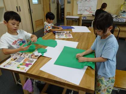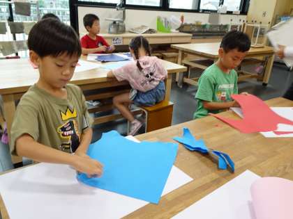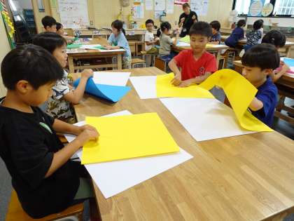 やぶいたかたちからうまれたよ(1年生) 公開日 2024/09/05 更新日 2024/09/05 1年生 図画工作科では、「やぶいたかたちからうまれたよ」の学習をしています。 大中小と3つの大きさに分かれた画用紙をゆっくり破り、破いた形を傾けたり回したりしながら 「猫の形に見える」 「オムライスの形かもしれない」 と見立てていました。 仲間と何に見えるか尋ね合う様子もあり、みつめる傾きによって、見え方感じ方が違うことに楽しさを感じていました。