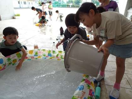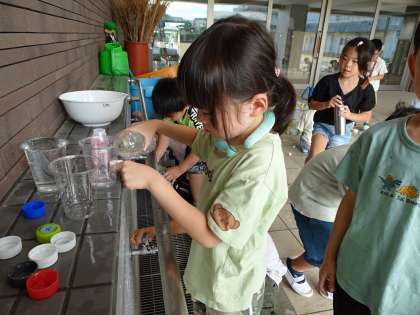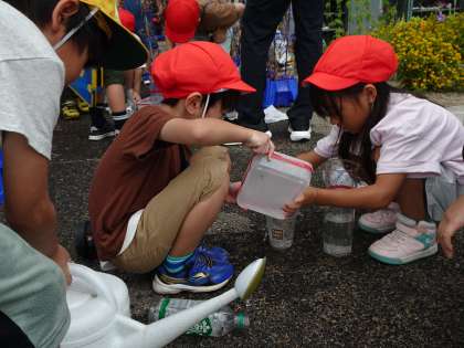 みずのかさをくらべよう(1年生) 公開日 2024/09/29 更新日 2024/09/29 1年生 算数科「みずのかさをくらべよう」の学習を行っています。 大きなゴムプールや、ペットボトルや水筒等、水のかさを量りたい物を自分で選び、何の容器で○杯分水が入るのか、一人ひとりが様々な容器を選択して量り、比べていました。