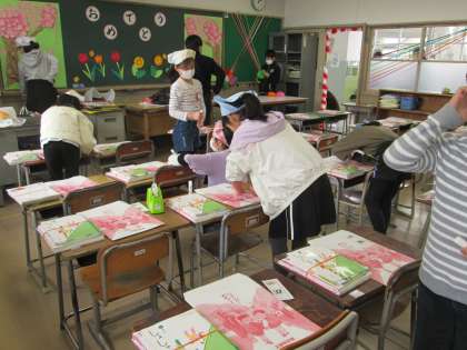 今年度の始業式は、コロナ対策のために教室で行われましたが、どの子も新年度に向け期待をもって臨んでいました。始業式後は、学級開き、学年開きを行い、明日の入学式の準備を行いました。