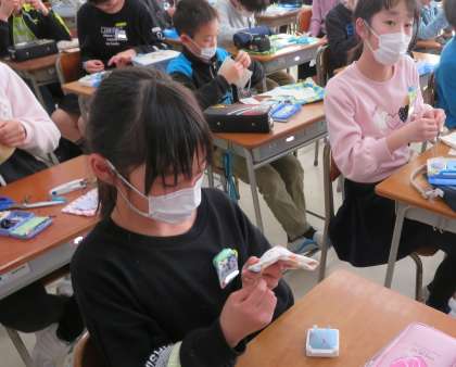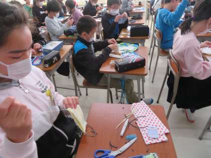 家庭科の時間に、マスクを手作りしました。久しぶりの手縫いに、はじめは戸惑う様子も見られましたが、少しずつ思い出し、1枚目のマスクが仕上がるとうれしそうにつけてみる子どももいました。