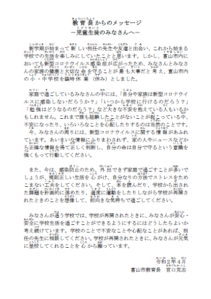 臨時休業期間延長について、富山市教育長から児童のみなさんへメッセージが届きました。ホームページ右側「配付文書」で見られます。明日からのお届け封筒の中にも入れますので、ご確認ください。