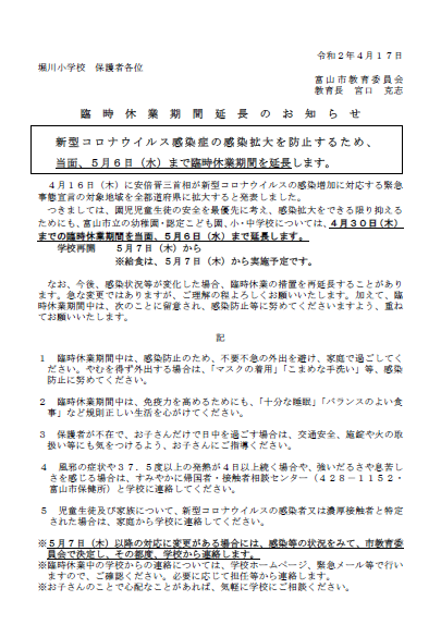 つきましては、園児児童生徒の安全を最優先に考え、感染拡大をできる限り抑えるためにも、富山市立の幼稚園・認定こども園(1号認定)、小・中学校については、4月30日(木)までの臨時休業期間を当面、5月6日(水)まで延長します。なお、学校再開及び給食再開は、5月7日(木)からとします。