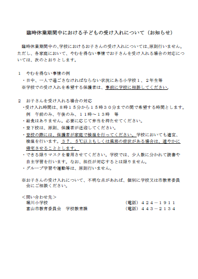 急な変更ではありますが、ご理解の程よろしくお願いいたします。なお、今後、感染状況等が変化した場合、臨時休業の期間を延長することがあります。